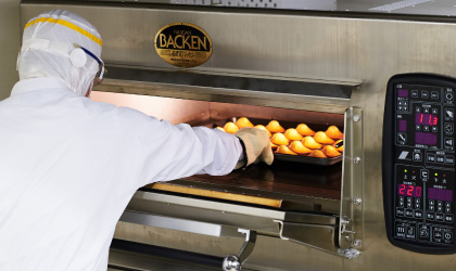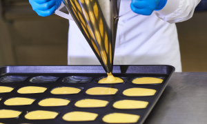 大型縦ミキサーで仕込んだ生地をデポジッターで型に充填し、貫通式トンネルオーブンで焼き上げる事で、大量ロットの生産を継続的に行う事が可能です。