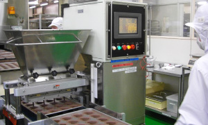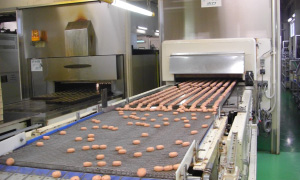 クッキーラインでは、オーブンから出た商品をコンベア上で放冷し、そのまま包装機に流れて来る仕組みになっており、量産が可能になっております。