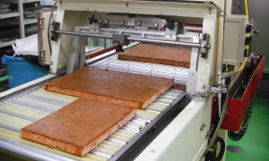 スライサーにて規定の大きさにカットした商品を大型金属検出器で検査し、トレーに入れ供給し、個包装していきます。